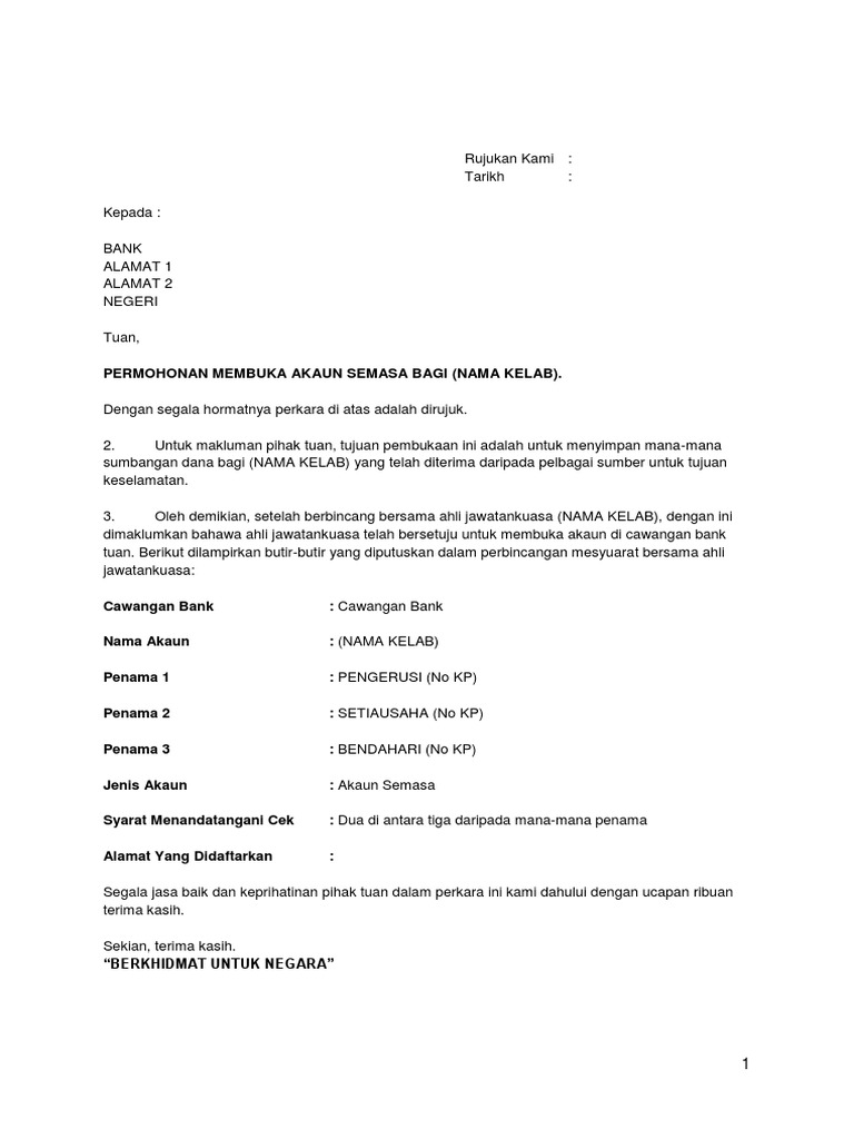 Bank alamat 1 alamat 2 negeri tuan permohonan membuka akaun semasa bagi nama kelab. Bank alamat 1 alamat 2 negeri tuan permohonan membuka akaun semasa bagi nama kelab. Home kerja contoh surat permohonan buka rekening bank lembaga download kamis 30 november 2017.